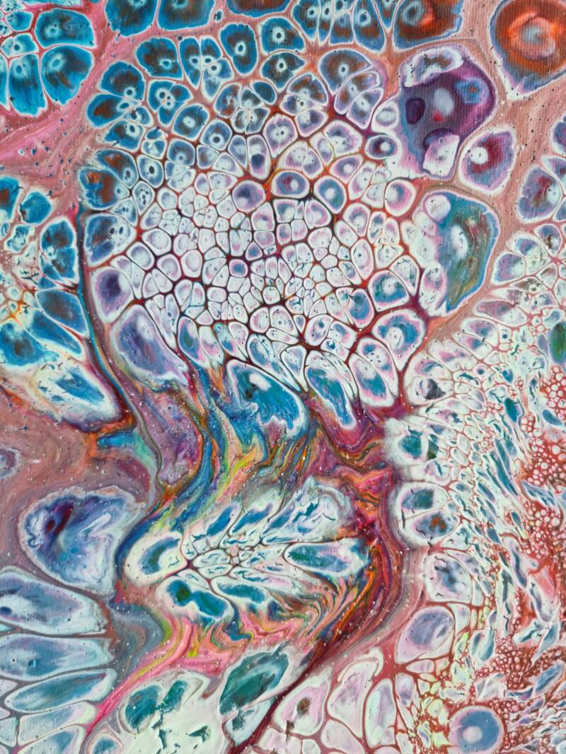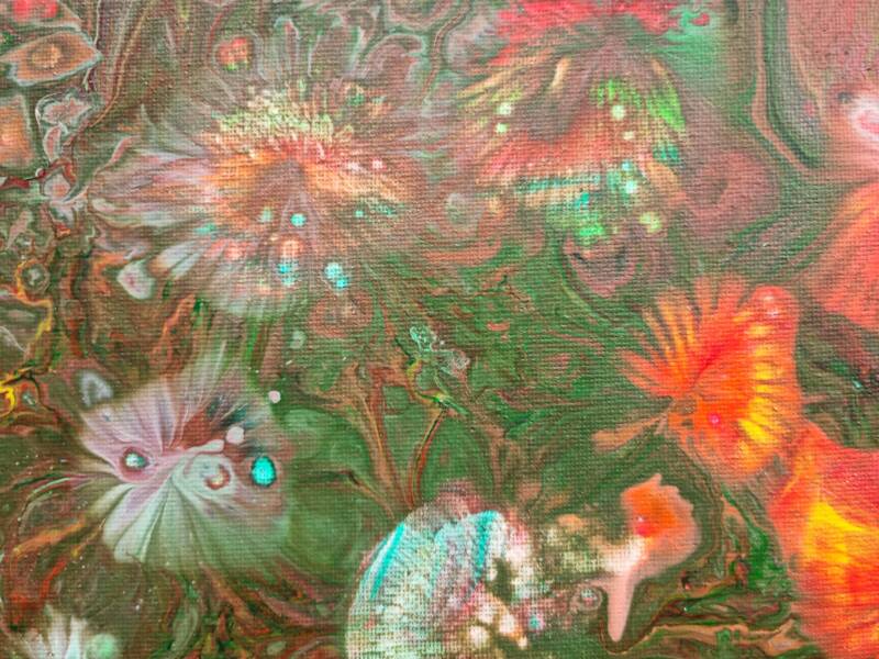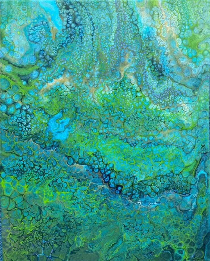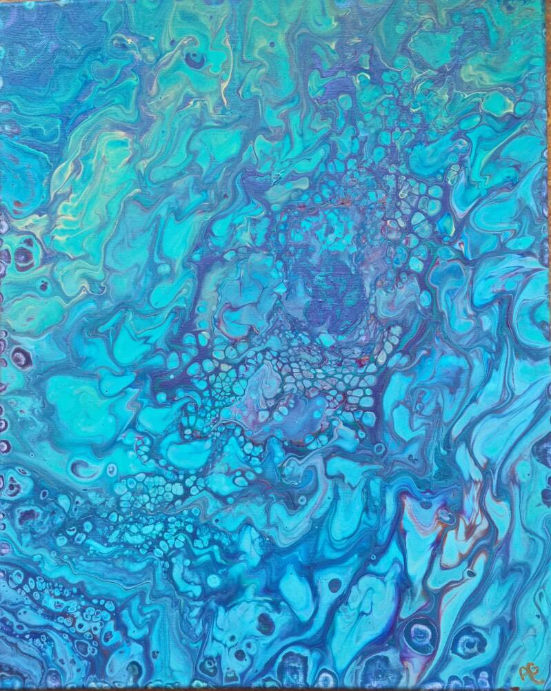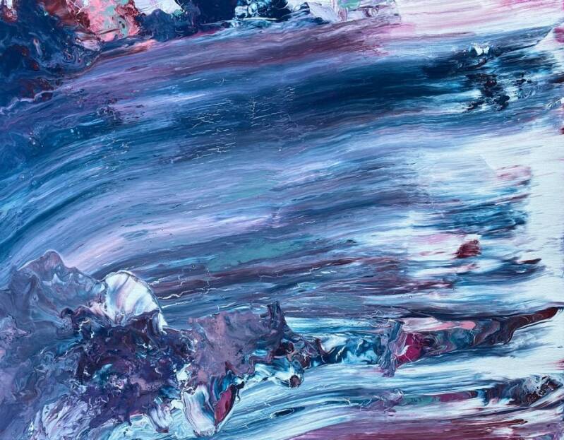 Het schilderij lijkt stil, maar wie kijkt, ziet beweging — een trage adem onder het oppervlak.