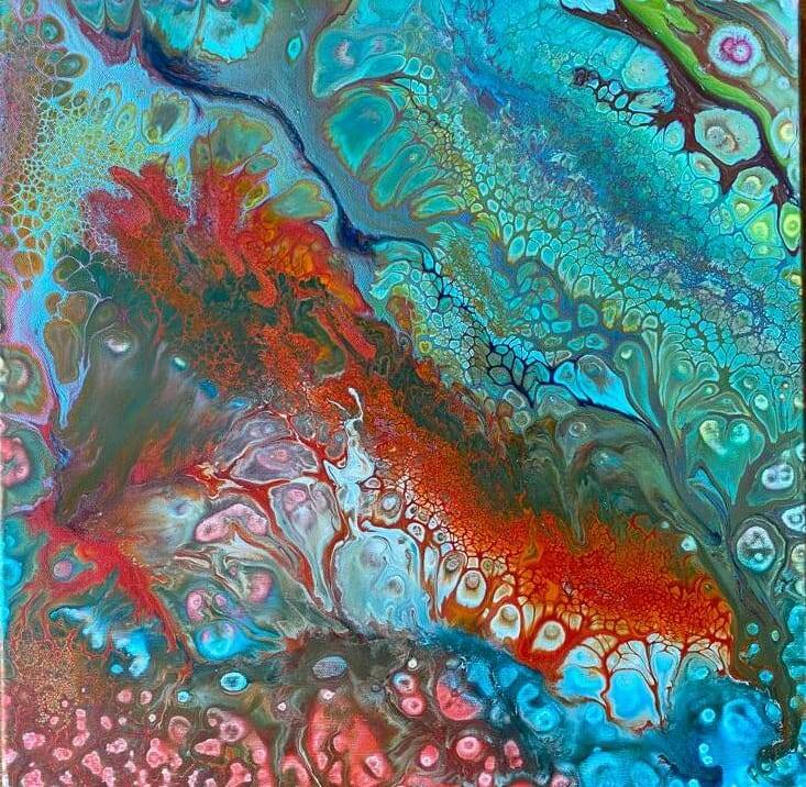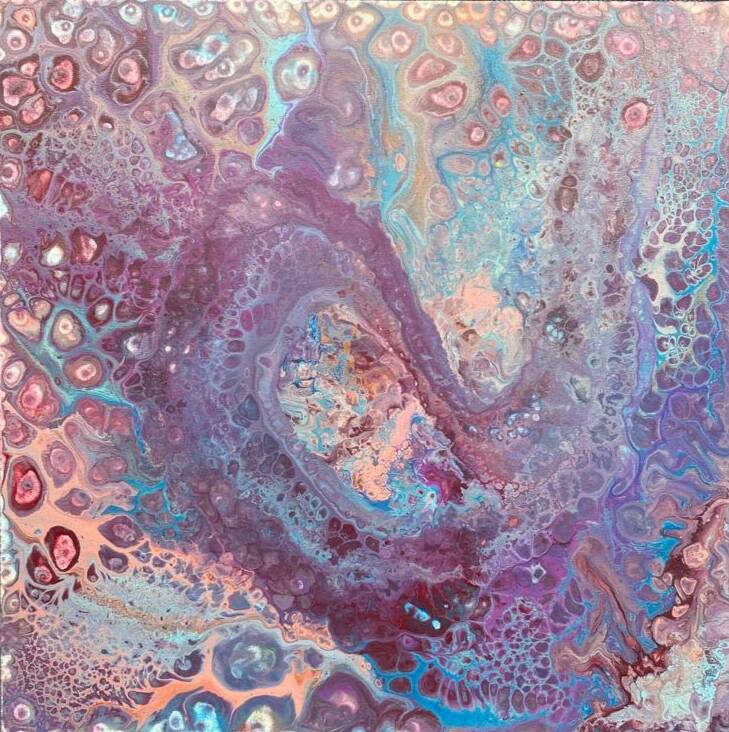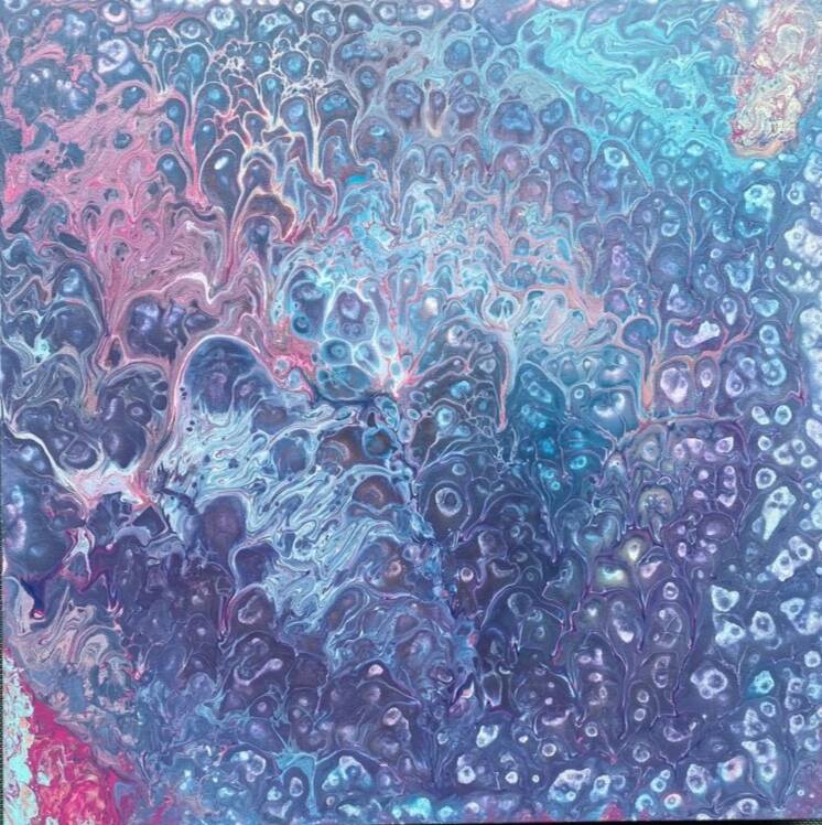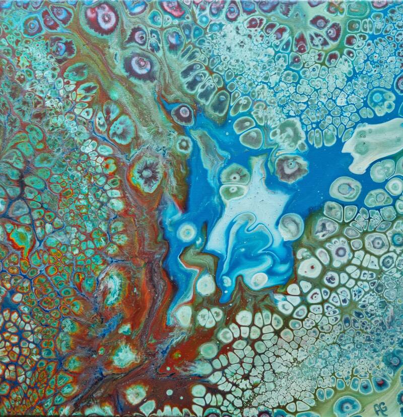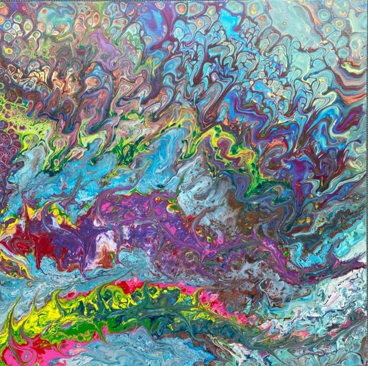 The colours swirl and collide in restless motion, a tension between beauty and suffocation.